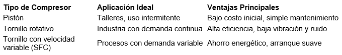No todos los compresores son iguales. Cada tipo tiene características específicas que los hacen más o menos adecuados para distintos entornos: