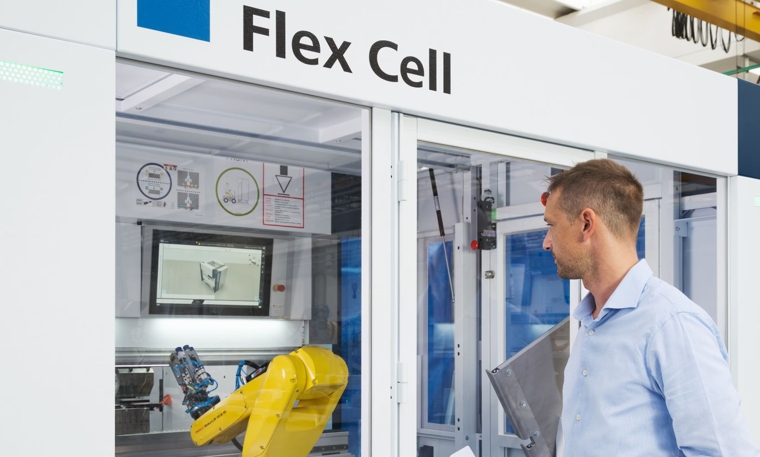 TRUMPF presentará en primicia su célula de plegado en formato pequeño Flex Cell en combinación con su software de programación TecZone Bend. La Flex Cell puede ser conectada a la plegadora TruBend 7050 en unos sencillos pasos para conseguir un plegado automatizado de gran rapidez que merece la pena incluso para componentes nuevos con lotes muy pequeños, con un formato de hasta 600x400mm y grosores de chapa de hasta 6mm. Además, puede programarse "offline" con TecZone Bend, por ejemplo desde la oficina, mientras la célula de plegado puede seguir produciendo piezas, favoreciendo una incremento de la productividad.